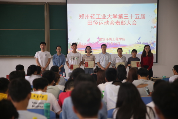 大会在一段精彩的运动会回顾视频中拉开序幕,伴着激昂的音乐,与会师生共同重温了运动会中奋力拼搏的场面与激动人心的瞬间。分团委副书记寇誉元宣读《建筑环境工程学院关于表彰郑州轻工业大学阳光体育活动暨第三十五届田径运动会获奖团体和个人的决定》,全体辅导员为获奖运动员颁奖。运动员代表戴祯韬分享了自己的参赛感受和体会,他对训练期间提供贴心服务的工作人员、运动场上共同奋斗的运动员及热情加油呐喊的观众表示了衷心的感谢,表示要继续努力,争取取得更加优异的成绩。学生代表李志刚代表工作人员、教练员对全体运动员的刻苦训练表示感谢,对大家取得的优秀成绩表示热烈祝贺,并就运动会中存在的问题进行了反思。