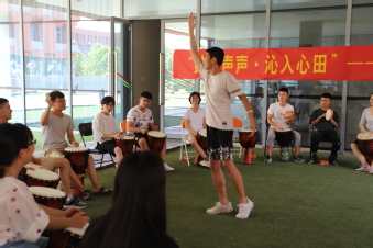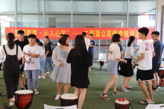 活动开始,姚少华老师对此次两个学院举办二级蒲公英使者培训活动阐述了目的与意义,讲述了心理团辅活动采用的科学方式,如:EFT情绪释放技术、舞动技术、音乐技术等,期望通过系统的培训,提升蒲公英使者的心理健康工作能力,进一步推进学校心理健康工作。本次培训则以音乐团辅形式带领大家体验。培训共分为四个环节。第一环节,陈思萌老师带领同学围坐成一个圆圈,引导大家学习了非洲鼓的击打方式,3种音色结合不同节奏型的演奏,并借助沙锤、串铃、三角架等各具特色的手鼓乐器,共同演奏了歌曲。这种以鼓圈合奏的形式,将手鼓乐器与歌曲旋律完美地融合在一起,优美的和声,感染了会场的每一位,体验到动静结合的美,体会了团队协作的精彩。陈思萌老师以音乐为触媒、通过音乐的旋律,让参与同学以身体的律动与音乐融合,起到破冰热身的作用,活跃了现场气氛,充分调动了大家的热情,提高活动的参与度。第二环节,“勇当引领者”环节,陈思萌老师首先做了示范,接着建工院和经管院各出一人作为引领者来指导同学们,现场气氛融洽,音乐声此起彼伏。第三环节大家跟随鼓乐的节拍点,以自创的舞姿的形式按照方向进行舞动。现场氛围紧张和热烈,大家专注地聆听引领者的鼓声与口令,欢声笑语贯穿着整个活动环节。活动充分考验了同学们的反应力和专注度,更进一步调动了大家积极性,增加了彼此间的亲密感,增添了活动的趣味性。第四个环节是让大家谈一下自我感受,分享心境故事。陈思萌老师也结合亲身经历进行交流,帮助大家更好的了解鼓圈,体验到鼓圈动静结合的美,体会了团队协作的精彩。