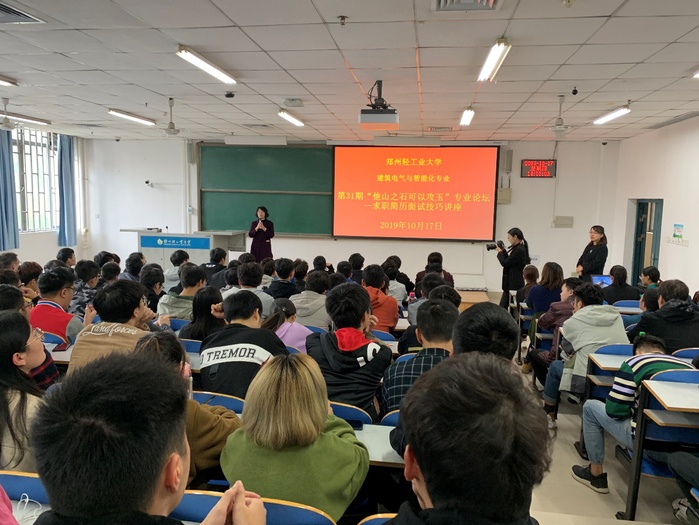 2019年10月17日下午,我校建筑环境工程学院在科学校区三教楼104教室举办了建筑电气与智能化专业“他山之石可以攻玉”专业论坛第31期,邀请该专业长期合作企业——天友建筑设计有限公司郑州分公司副总经理兼人力资源总经理樊超女士,为该专业2016级毕业生做“求职面试与技巧分享”讲座。讲座由建筑电气与智能化系副主任武东辉主持,天友建筑设计有限公司天津总部及郑州分公司人力资源负责人、建筑环境工程学院副院长曹祥红、建筑电气与智能化专业部分教师参加。