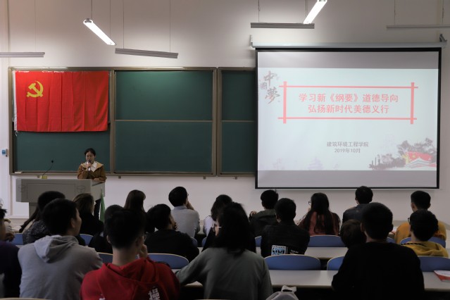 为推进新时代大学生思想道德建设,培育和践行社会主义核心价值观,10月31日,建筑环境工程学院于双创楼108室开展 “学习新《纲要》道德导向、弘扬新时代美德义行”教育活动。建筑环境工程学院第62期入党积极分子培训班全体学员参加此次活动。