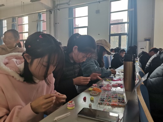 活动开始,主持人向大家讲解活动规则,并鼓励同学们发挥自己的想象力和创造力,将手中的材料变成理想的作品。大家开始构思后,积极选取喜欢的材料。在整个活动进行过程中,大家放下浮躁,慢慢忘记压力和烦恼,沉浸在创意迸发的世界里,每个人的脸上都洋溢着笑容,不时传来阵阵欢笑声。在大家的手下,太空泥被塑造成各式各样的卡通人物;七彩的水魔珠变成了栩栩如生的小动物;五颜六色的扣子被大家串成了各种各样的图案和花纹;就连看似平淡无奇的刮画纸,也被同学们赋予了满满的祝福和期盼。活动进行到尾声时,主持人邀请同学们分享自己作品的故事,一个个精彩绝伦的作品背后,也蕴含着大家对生活的理解和感悟。