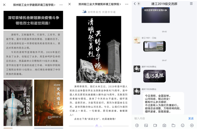 为表达对抗击新冠肺炎疫情斗争牺牲烈士和逝世同胞的深切哀悼,上午 10 时,身在家中的青年学子们放下手中的书本、停下匆匆的脚步,伴着凄厉的防空警报庄严肃立,在线上线下向新冠肺炎疫情牺牲烈士和逝世同胞沉痛志哀。为进一步引领青年学生继承抗疫奉献精神,学院通过微信公众号、QQ等平台广泛宣传清明传统民俗及抗疫英雄典型事迹。学院广大青年学生主动通过“中国文明网”“中华英烈网”“河南文明网”“郑州文明网”等网上平台对先烈先辈们和牺牲在战“疫” 一线的英雄们进行缅怀和悼念。