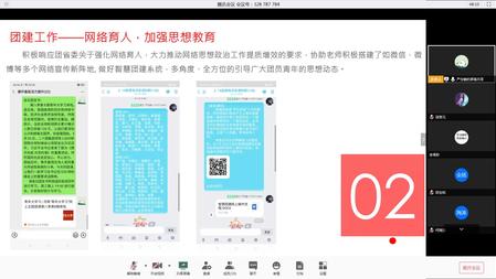 经过前期个人申报、团支部民主评议、材料审核等环节,申报十佳团员、十佳团干、十佳红旗团支部的先进个人及团支部代表参与了线上展示答辩。会上,各先进集体代表从团组织建设、思想引领、学风建设、社会实践、志愿服务、特色工作等方面对团支部工作进行了展示汇报,各先进个人围绕思想与理论学习、专业学习、科技创新、文体活动、志愿实践等方面分享了自身成长经历与体会,并回答了评委老师的问题。汇报结束后,分团委副书记寇誉元作总结发言,她对各团支部的工作及各先进个人取得的优异成绩给予充分肯定,并鼓励大家再接再厉,开拓创新,勇挑重担,敢于担当,早日成长为堪当大任的新时代青年。
