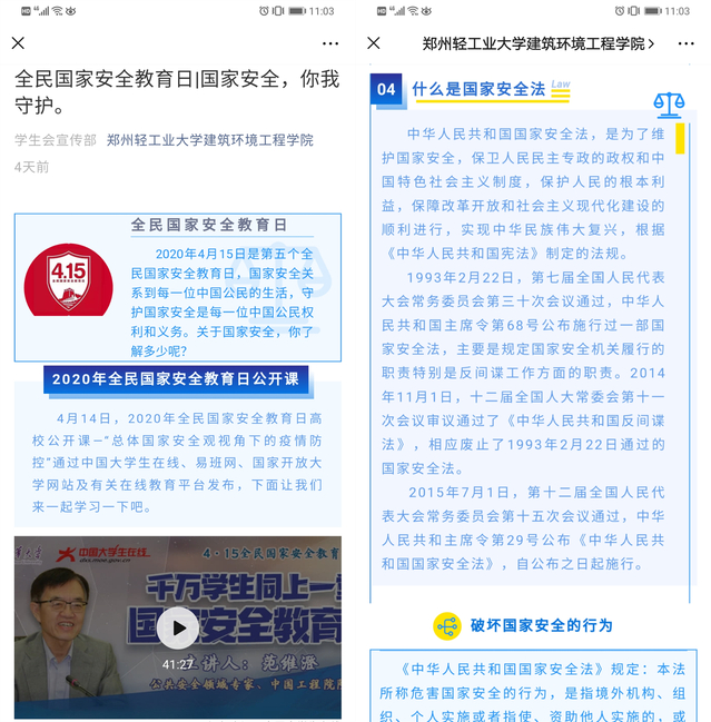 2020年4月15日是《中华人民共和国国家安全法》颁布后的第五个全民国家安全教育日。为深入学习习近平总书记关于总体国家安全观的重要论述及相关法律法规,增强师生国家安全意识,4月15日至17日,建筑环境工程学院组织全体学生观看了2020年全民国家安全教育日高校公开课。