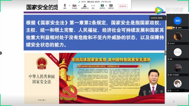 公开课上,公共安全领域专家、中国工程院院士范维澄教授以《总体国家安全观视角下的疫情防控》为题,讲述了我国的总体国家安全观、生物安全与公共卫生安全治理、疫情对社会发展的影响、维护公共卫生安全和生物安全和如何做好日常防控工作等五方面内容,重点介绍了此次新冠肺炎疫情对国家安全、全球经济、中国国际政治环境等方面的影响。这堂生动的国家安全教育课在学生中引起极大反响,同学们纷纷表示,此次新冠肺炎疫情使大家深切感受到国家安全是国家生存和发展最基本、最重要的前提,维护国家安全人人有责、人人可为,作为青年学生要牢固树立国家安全意识,遵守相关法律法规,以实际行动维护国家安全。