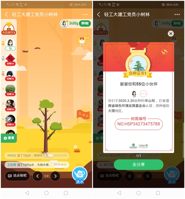 为提升广大党员植绿、爱绿、护绿、兴绿的环保意识,践行绿色低碳生活理念,学生党支部积极通过支付宝蚂蚁森林平台进行线上植树,以实际行动贯彻创新、协调、绿色、开放、共享的发展理念,为保护和美化共同生活的家园贡献青春力量。