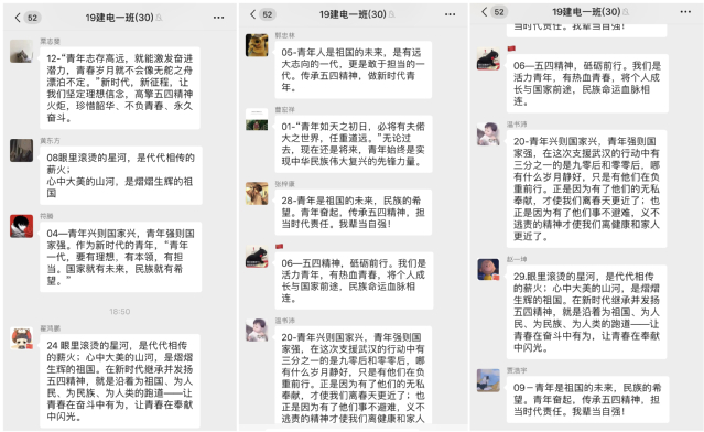 活动中,同学们学习了习近平总书记五四青年节寄语,重温了五四运动暴发的历史背景及发展历程,感悟了五四运动的深刻历史意义与五四精神的丰富内涵。此外,建筑电气19-01班团支部共同观看了微视频《海外抗疫,青年担当》,学习了身在海外的中国青年坚守岗位、坚决打赢境外疫情防控狙击战的责任与担当;安全工程19-01班团支部共同听红歌、唱团歌、忆历史,激励同学们发扬五四精神、牢记责任担当;建筑环境19-01班团支部学习了习近平总书记在纪念五四运动100周年大会上的讲话精神,聆听了习近平总书记的殷切嘱托。同学们纷纷表示要继承和发扬伟大五四精神,砥砺奋进、开拓进取,争做新时代的奋斗者和追梦人。