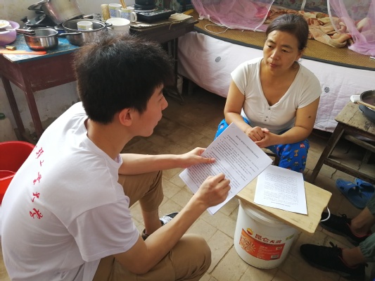 7月10日上午,小分队来到王梦哲同学的家里进行走访调查。在交谈中,队员对王梦哲同学的家庭情况有了更进一步的了解。随后,分队成员向王梦哲同学发放了河南省高校学生资助手册和其家人一起阅读,并对他们不理解的地方做了详细的介绍和解释。