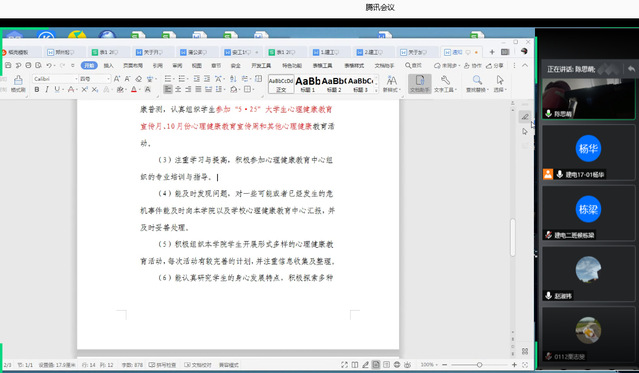 首先,副书记彭东来对疫情期间大家所做的心理健康教育工作进行肯定,总结了疫情以来所开展的活动,包括全面对班级同学心理状态变化情况进行摸底排查、“5·25心理健康月”活动的开展情况、日常心理健康工作会议召开等内容。陈思萌老师则对5月所开展的蒲公英素质拓展活动中所出现的问题、不足进行补充。而后对于班级心理委员及心理部成员的职责进行详细说明,强调心理健康工作的重要性,在特殊时期要积极在班级里宣传心理健康知识,营造良好的心理健康氛围。最后,陈思萌老师提到学院心理特色工作的发展任重道远,希望同学们可以更好地夯实自己,提高自己的知识技能,更好地为班级同学服务,让心理健康教育工作渗透到每位同学的身边。
