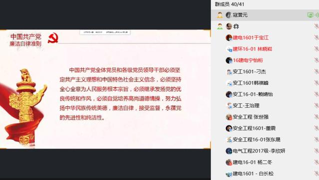 学院面向全体毕业生党员开展“廉洁自律,初心铭记”廉洁教育活动,学生党支部书记带领全体毕业生党员再次学习了《中国共产党廉洁自律准则》及《中国共产党纪律处分条例》,详细解读了两部法规的突出特点和现实针对性,要求全体毕业生党员把严守政治纪律和政治规矩放在首位,知敬畏、存戒惧,廉洁修身、廉洁从业。支部书记带领全体毕业生党员重温入党誓词,党员们精神饱满,表情肃穆,声音洪亮,在铮铮誓言中重温入党初心,坚定报国使命。
