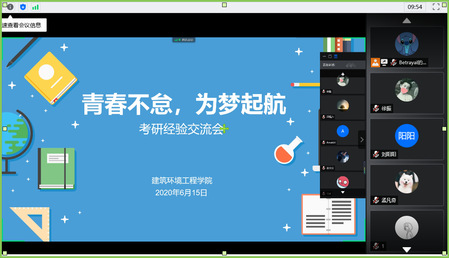 为进一步加强优良学风建设,营造浓厚学习氛围,帮助学生明确考研目标,掌握考研技巧,6月15日晚,建筑环境工程学院举办“青春不怠,为梦启航”线上考研经验交流会。2016级优秀考研学子及2017级各班级学生代表参加此次活动。