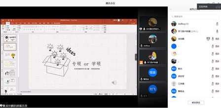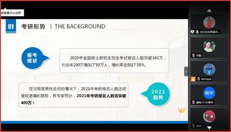 本次交流会邀请了四位在研究生考试中取得优异成绩的2016级学生代表在线上作经验分享。各位代表结合自身经历,从考研目的、考研形势、复习计划、复习方法、复习资料选择、院校及专业选择、考研心态调整等方面进行了详细介绍,鼓励大家尽早明确方向,在学好自己专业课的基础上,多关注报考院校以及专业的相关信息,摆正心态、认真学习,勇于追梦、勤于圆梦。在现场提问环节中,有考研意向的同学争先恐后地向学长学姐提问,各位考研学生代表对每一个问题进行了耐心、细致的解答,并激励2017级考研学子坚定信念、脚踏实地、刻苦学习,争取成功升学。通过不断地交流,同学们消除了误区,掌握了方法,积累了经验,明确了认知。