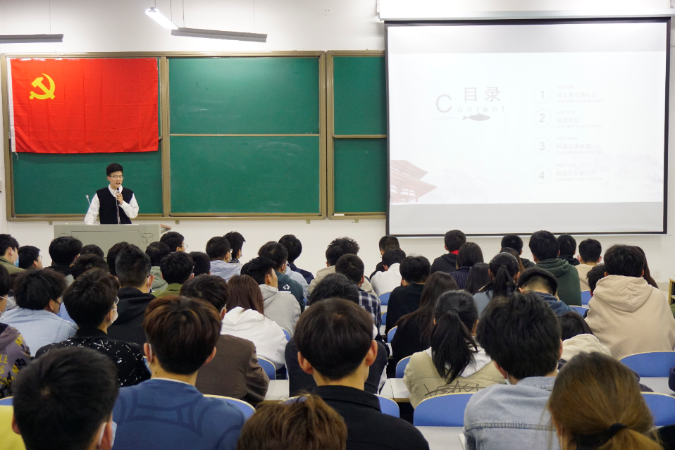 活动伊始,主持人以孔融让梨、张良拜师、程门立雪等典故为切入点,分别讲述了谦让,礼逊,尊师之礼,并向同学们阐释了什么是文明,什么是礼仪,以及礼仪的四大原则。接着,主持人又向同学们分别介绍了何为校园五大礼仪、四大文明,对同学们的日常行为规范做出明确要求,鼓励同学们踊跃参加宿舍文化艺术节、光盘行动等校园文明创建活动。随后,主持人列举了一些典型的校园不文明行为,提醒大家引以为戒,并以调查问卷的形式做了有关日常文明礼仪问题的调查,同学们认真思考,积极回答。最后,主持人呼吁大家“以礼始,以礼终,大家应把文明礼仪,内化于心,外化于行,争当新时代的文明青年”,在一片热烈的掌声中,此次活动圆满落下帷幕。