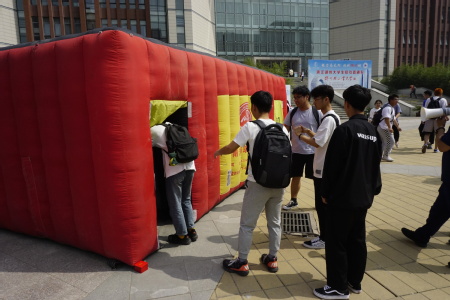 本次消防安全科普宣传活动由常用灭火器的使用与火场逃生两个部分组成。工作人员向同学们详细讲解并演示了灭火器具,如手持式干粉灭火器、简易式水基型灭火器、推车式高压水雾灭火器等的使用方法、技巧,其中简易式水基型灭火器、推车式高压水雾灭火器为建筑环境工程学院安全工程专业学生自主创业开发的灭火器,同学们在实际操作中将大火扑灭,切实掌握了灭火器的使用方法。火场逃生采用逃生帐篷,只有进出两个口,进出口上设有遮光用的门帘,提前在帐篷内充满对人体无害的白色烟雾,并且没有照明,切实让进入帐篷的人犹如亲临火场一般,同学们按照工作人员的讲解,用水沾湿毛巾、捂住口鼻,弯下腰进入烟雾缭绕的帐篷,并在漆黑的帐篷内在疏散指示标志的引导下找到正确通道。