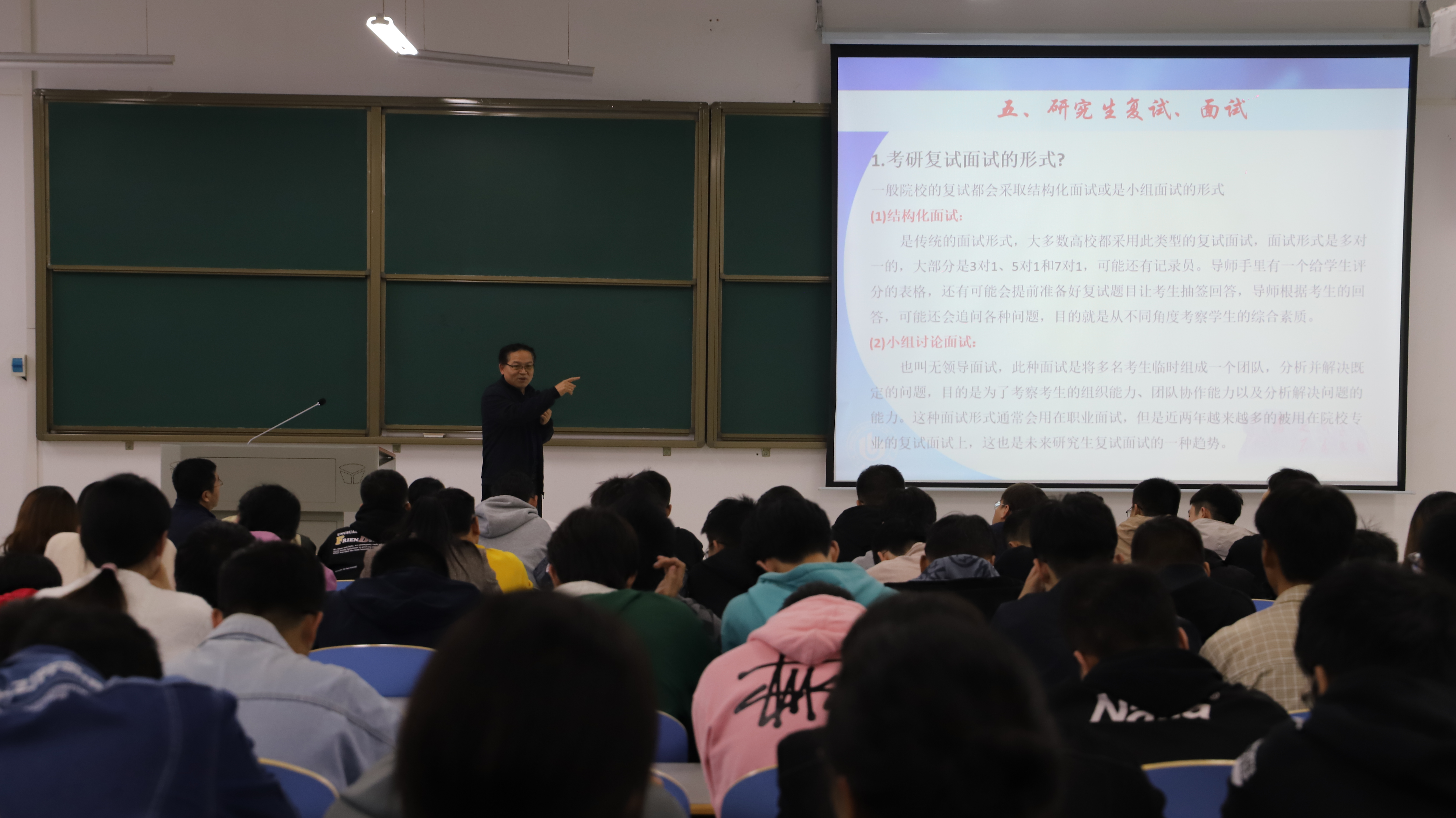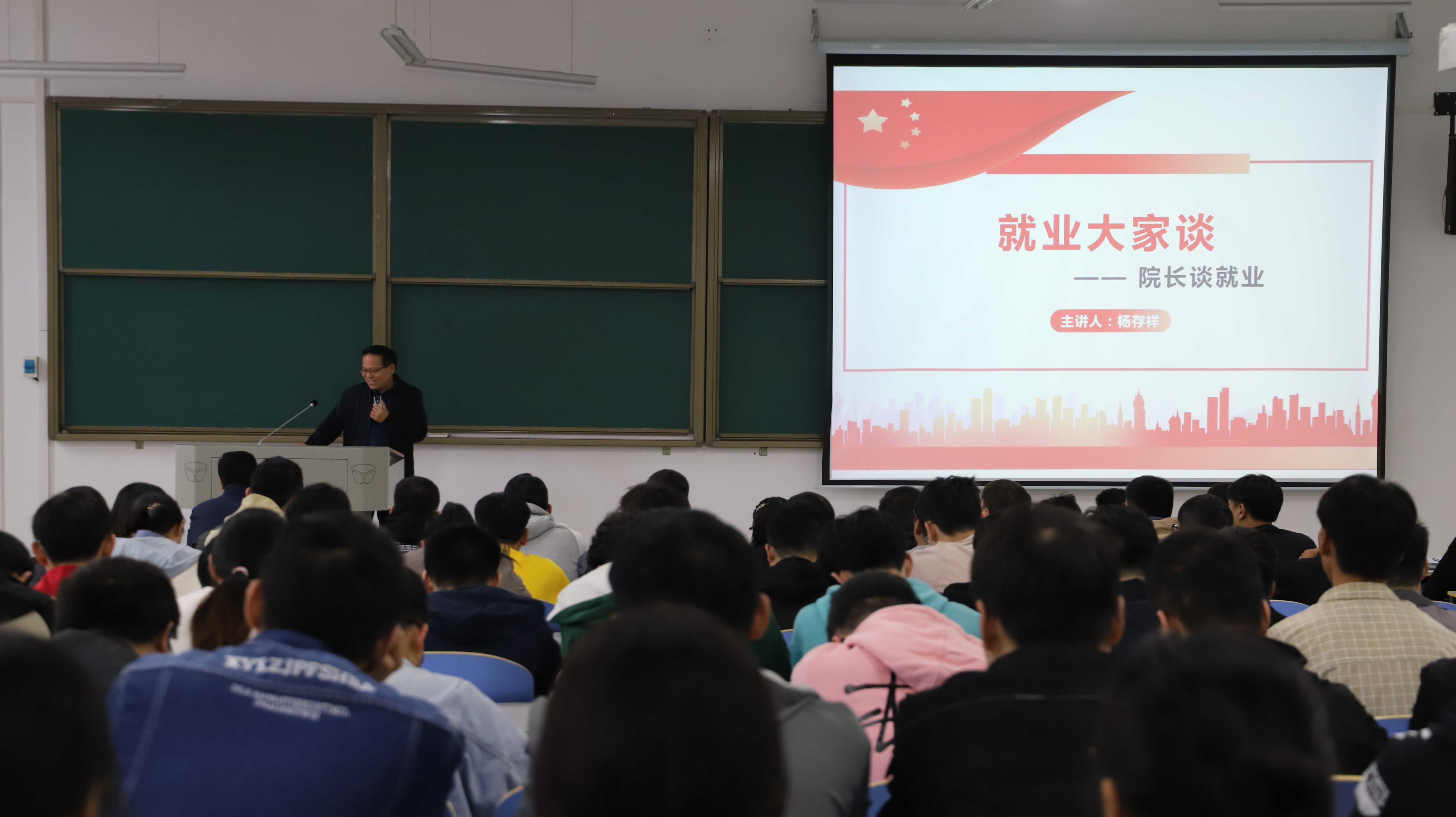 活动伊始,杨院长结合自身的发展经历,以幽默诙谐的话语讲述了往届毕业生步入职场后的经历感悟,活跃了现场气氛。接着,杨院长从高等教育分类发展、大学生应具有的能力、就业领域和职业、就业面试、工作中的表现、研究生阶段的学习态度、人生目标等七个方面与大家做了深入交流,并结合近年来学院的毕业生就业去向、发展情况,分析了学院三个专业的未来发展前景和就业方向,增强了同学们对未来职业发展的信心。