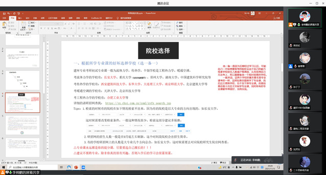2021届建筑电气与智能化专业校友李永琪从自身考研经历出发,围绕考研信息获取、专业方向和院校选择、考研准备等方面进行了详细介绍,鼓励大家尽早明确学业研究方向,在学好自己专业课的基础上,多关注报考院校以及专业的相关信息,勇于追梦、勤于圆梦。
