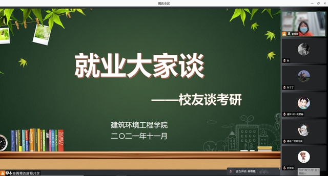 近日,建筑环境工程学院举办了第七期【就业大家谈】“校友谈考研”线上活动,邀请了2020届、2021届优秀考研校友作为嘉宾,从学业生涯规划、考研院校选择、考研复习经验、考研心理调适、个人简历制作等方面进行了经验分享与方法指导,并耐心、细致地回答了同学们提出的问题。学院一二三年级有考研意向的学生参加了此次活动。