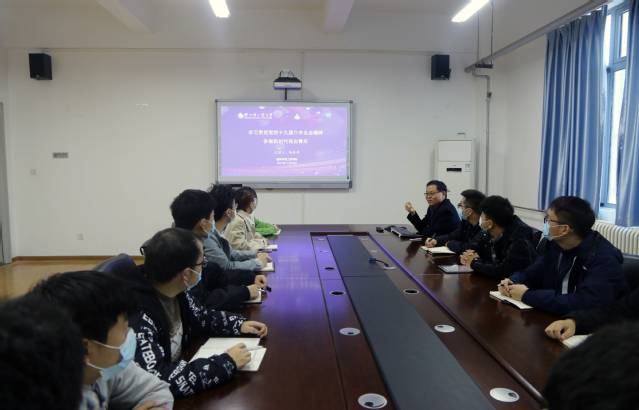 首先,杨存祥院长为大家解读了党的十九届六中全会精神,引导同学们要深刻把握理想信念和初心使命的时代要求,在坚定理想信念、牢记初心使命上持续努力,切实把思想和行动统一到六中全会精神上,努力做到学思践悟,不断提升自身综合素质,起到研究生示范引领作用,担当起新时代青年的责任与使命。此外,杨院长结合十九届六中全会精神围绕“研究生教育、创新创业、科学研究、工程伦理、法治教育”等方面与学生们进行深入交流。希望同学将学习六中全会精神深化到自己的学习和科研中,“坚持创新、严谨治学、自觉践行、服务社会”。