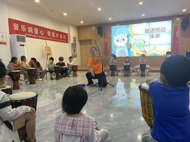 音乐素养小讲堂结束后,志愿者带领小朋友进行了趣味十足的鼓圈音乐团辅活动,小朋友在形式各样的乐器中挑选出自己最喜爱的一件,随后大家围坐一圈,由志愿者首当“鼓圈引领者”,讲解非洲鼓的基本演奏方法,并借助沙锤、音树、手鼓等各具特色的乐器,指挥小朋友们共同演奏振奋人心的打击乐,让大家深刻感受到团体互动的美妙,体会到团队合作的精彩,完成对自我音乐表达的肯定。演奏技巧演示完毕之后,小朋友踊跃体验小小指挥家这一角色,在小指挥家的引领下,各种乐器的音色互相呼应,演奏出更多美妙的音乐。