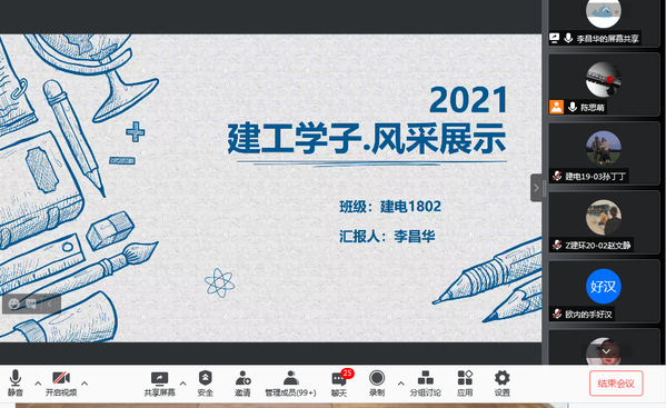 大会伊始。向参会同学讲解了国家奖学金、励志奖学金资助政策以及申报各类荣誉称号的条件、要求。然后介绍了本次国家奖学金及各类荣誉称号的申请评审流程,通过前期同学自主申报,学院评审小组评议出国奖及各类荣誉称号候选人若干名,进行风采展示环节。在风采展示环节中,国家奖学金、三好学生标兵、优秀学生干部标兵等荣誉候选人进行了精彩演讲。演讲主要以PPT展示的形式进行,候选人主要对入校以来的学习、生活和工作情况进行了总结,对已取得的成绩进行了展示。同时,对自己提出了更高的要求,希望在青春的奋斗中更上一层楼。卓越的成绩,让参会者感受到了学子的不懈努力与拼搏!他们出色的表现展现了建工学子昂扬向上的精神风貌,给予了21级新同学极大的鼓舞和激励,对加强学院学风建设,提高同学们刻苦学习的意识具有积极意义。