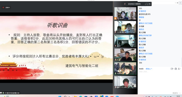 本次活动以线上做游戏的形式展开,不仅使在疫情封控下同学们的心情得到愉悦,还拉近了同学们间的距离。活动包含“你画我猜”、“听歌识曲”、“狼人杀”三个部分。“你画我猜”中同学们充分发挥想象力,画者天马行空的想象和猜者千奇百怪的回答令大家啼笑皆非,一开始就营造出了欢声笑语的游戏氛围,每个人都参与其中,如同温馨的家庭其乐融融。“听歌识曲”中主持人通过ppt中保存的音频播放给大家,我们看到同学们时而认真思索,时而闭眼欣赏,一首首优美的乐曲从电脑中传向各个寝室中的同学,同学们的回答和感受也从电脑中传递给每一个参与其中的人,我看到的不仅仅是游戏,更有同学们在鉴赏音乐时产生的共鸣,并在其中寻找到彼此的共同点。“狼人杀”是本次活动的压轴游戏,在主持人的带领下,同学们欢声笑语,友谊第一,比赛第二,处处洋溢着开朗向上的氛围。在最后,建筑电气与智能化二班的女生寝室赢得了比赛的第一名,主持人为她们颁发了象征着友谊和荣誉的小奖品。