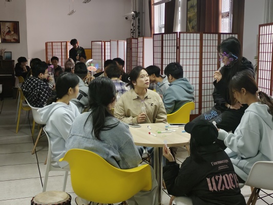 本次活动紧扣“情绪疏导、人际融合”核心目标,精心设计了 “鼓圈音乐”和“DIY扇子”以及“情绪交换站”环节,助力同学们在轻松愉悦的氛围中缓解心理压力、增进同窗情谊。“鼓圈音乐”作为开场环节,迅速点燃了现场气氛,这一环节不仅让同学们在音乐互动中提升了节奏感与韵律感知力,更在集体配合中深刻体会到团队协作的魅力,有效增强了团队凝聚力。“DIY扇子”环节更是为活动增添了温情,同学们在扇子上画下心爱的图案,通过趣味的绘画增进了彼此间的交流,放松了身心。“情绪交换站”借助这种交换心情的方式,聆听自己的心声,倾听他人的想法,在交换中释放自己的情绪,解答他人的困惑,实现对彼此的治愈。通过分享彼此的情绪,培养学生的同理心,理解并感受到他人的情绪。