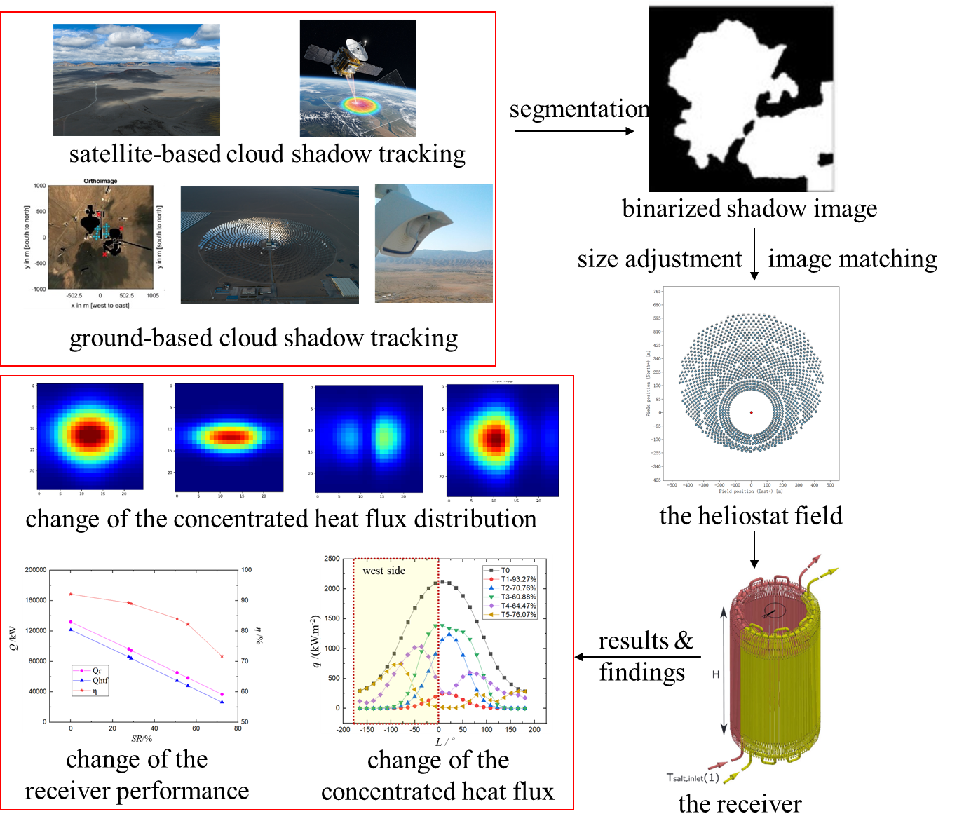 针对塔式光热发电技术云层引起的聚光能流密度波动,造成接收器热性能和热致安全问题,课题组提出了将云层阴影投影到定日镜场的方法,并分析云层阴影的形状、阴影移动和云层透过率对聚光能流密度及接收器热性能的影响规律,可为云层影响下接收器的安全可靠分析提供理论和方法支持。